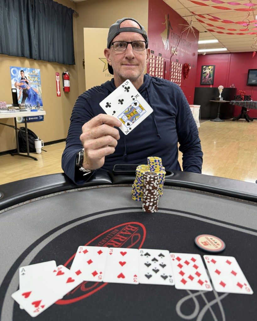 In 2nd place was Ranjit “All or Nothing” Randhawa, giving him two wins and a 2nd place to catapult him into the middle of the guaranteed seat bracket. In 3rd place was Patsy, who made a great run for the victory but came up just short. In 4th place was that new guy, Scott N, who clinched a Main Event seat with his eight final table appearance of the season (the most this season). In 5th place was Jon Towers who earned just enough points to sneak into the playoffs. Likewise, Tombie rallied from Jim’s suck-out to get 6th place and also squeak into the playoffs.