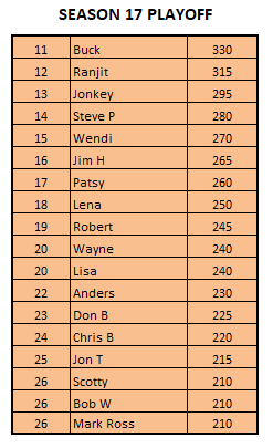Our playoff field is also now set with Buck, Ranjit and Jonkey as the top three seeds. Congratulations again to both Robert and Don as they both came from below “the line” to earn a playoff seat and chance at winning a $1,500 or even a $10,000 WSOP seat!