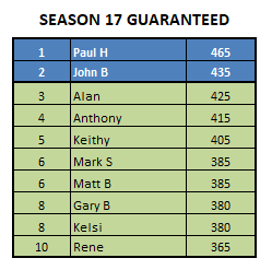 Link to the Season 17 Leaderboard, Results, Stake and Schedule