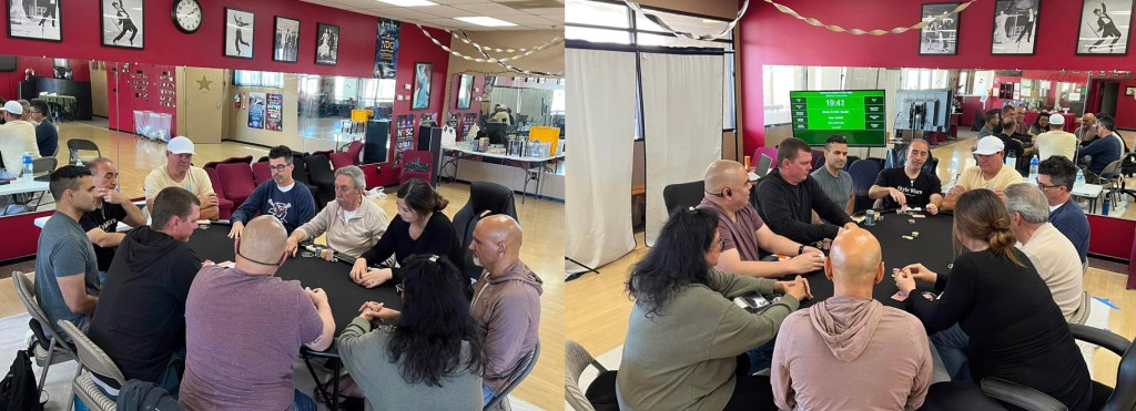 The players began with an average of 170,000 chips with the top seed starting with 200,000 and the bottom seeds (our three playoff winners) starting with 150,000 each. The levels were 40 minutes long (starting at 1k/2k/2k) from levels 1 – 6 and 35 minutes in length beginning in level 7.