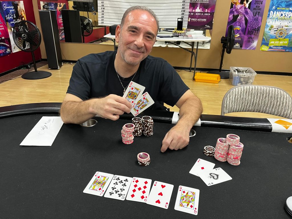 …Lena was devastated when the board ran out Q39TJ to give Anthony a runner, runner, runner Broadway straight. In 3rd place was Kelly, with his second final table of the season. Patsy came in 4th place to get into the mix in just her third event of the season. Dana Mendel came in 5th for her second final table finish. Finally, Dreadman and Scotty came in 6th and 7th to round out our money winners.