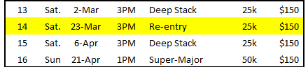 Next Up: The 13th event of Season 18 will be held on Saturday, March 2nd at 3pm. This will be a Regular Deep-Stack Tournament with a 25k starting stack.